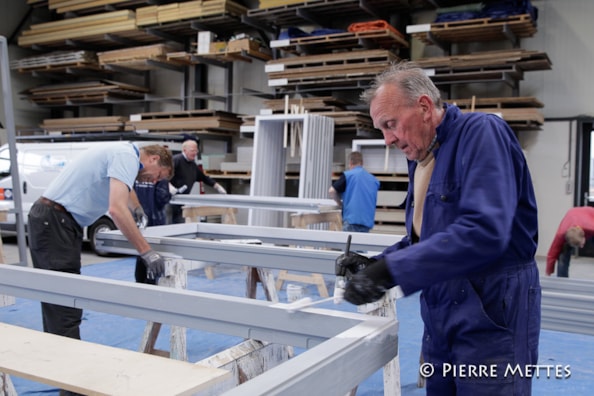 De kozijnen voor de verbouwing worden geschilderd in het pand van de firma P. Ott
